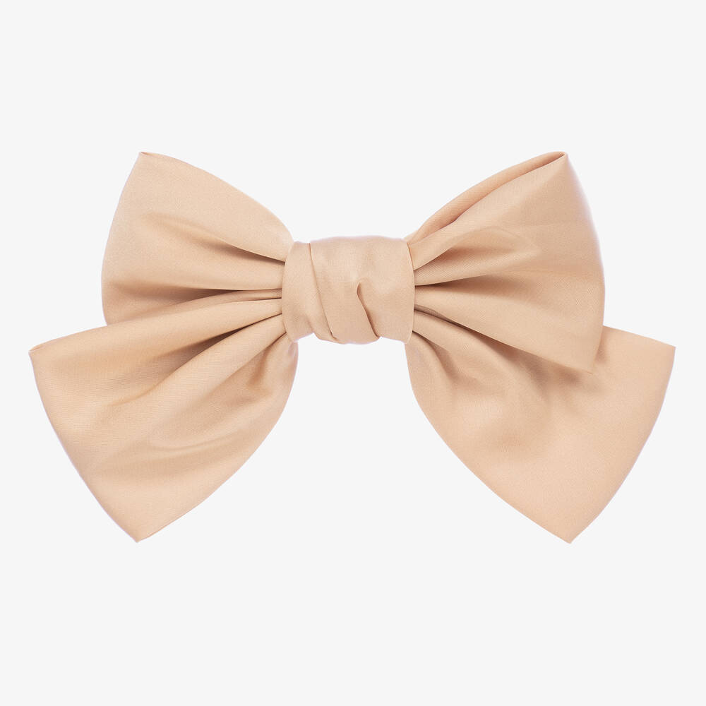 Beige hair clip for girls from British designer Bowtique London. The handmade bow decoration is made in silky satin to add a touch of glamour to an outfit. It fastens easily with a metal clip.