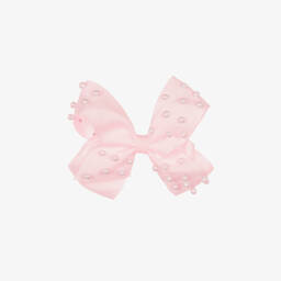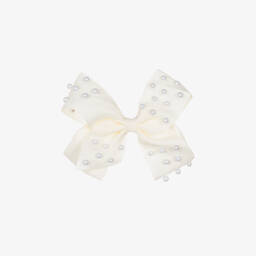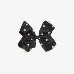 A pretty black grosgrain bow hairclip for girls by Bowtique London, decorated with scattered faux pearls. It is attached to a metal crocodile clip.