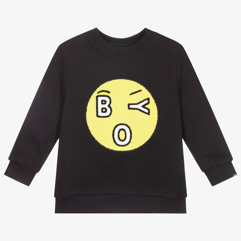 Black sweatshirt for boys and girls by BOY London, made in soft and stretchy cotton fleece jersey with ribbed trims. It has a bright yellow and white towelling emoji patch on the front.