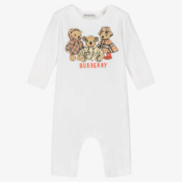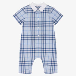 Beige cotton romper for baby boys by Burberry, featuring the luxury British brand's iconic Burberry Check pattern for a classic and stylish look. This charming babysuit is designed with a contrasting white collar, cute patch pockets, and front button fastenings, with poppers between the legs for easy changing.