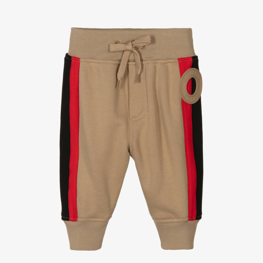 Beige joggers for baby boys by luxury British brand Burberry, with a large rubberised logo on one leg and sporty red and black stripes along the sides. They are made in soft, stretchy cotton jersey for all-day comfort with ribbed cuffs for cosiness and a useful patch pocket around the back. Easy to wear, they have a drawstring waistband for a good fit.