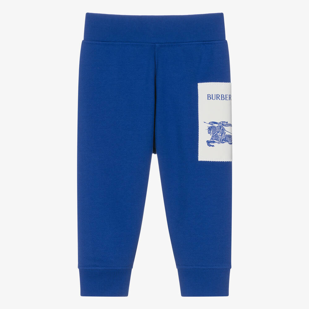 Contemporary cobalt blue cotton joggers for baby boys by luxury designer Burberry, in soft and stretchy jersey. Cool for loungewear styling, these comfortable trousers have stretchy trims with a signature Equestrian Knight Design patch on the side.