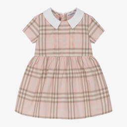 Lovely for baby girls, a beige dress by luxury British brand Burberry. Patterned in the designer's distinctive Burberry Check, this sweet style is made in lightweight organic cotton poplin, with pretty capped sleeves and a gently gathered skirt. It fastens with buttons down the front.
