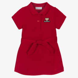 A lovely pastel pink polo-style dress for baby girls by luxury British label Burberry, made in soft organic cotton piqué. Soft and comfortable in an A-line shape, it features the brand's beloved Thomas Bear logo patch on the chest and the signature Burberry check on the button placket.
