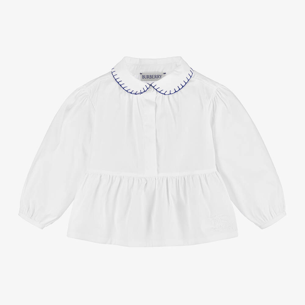 A lovely white blouse for baby girls by luxury British designer Burberry. It has a pretty peplum hem, embroidered with a tonal Equestrian Knight Design for subtle yet distinctive branding. The long sleeves are gently puffed, and the classic Peter Pan collar is trimmed with contrast stitching in blue. Made in stretch cotton poplin for comfort, the top has a concealed button placket on the front.