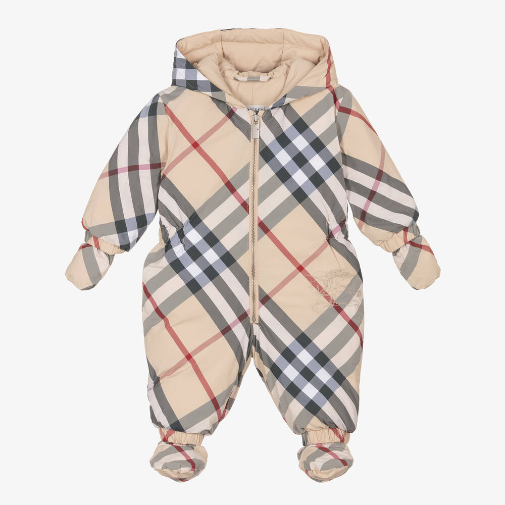 Beige Check Down Padded Baby Snowsuit