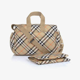 In the brand's signature Vintage check print, an archive beige changing bag by British luxury label Burberry, detailed with stunning gold hardware. The spacious zip-fastening main compartment has an internal zip pocket and elasticated pouches to help keep all the baby essentials organised. It has a fixed carry handle and comes with a black jacquard logo shoulder strap, which is fully adjustable for versatile wear. There are pockets on the sides for baby bottles or other small essentials. The front, quilted compartment contains the black, padded changing mat.