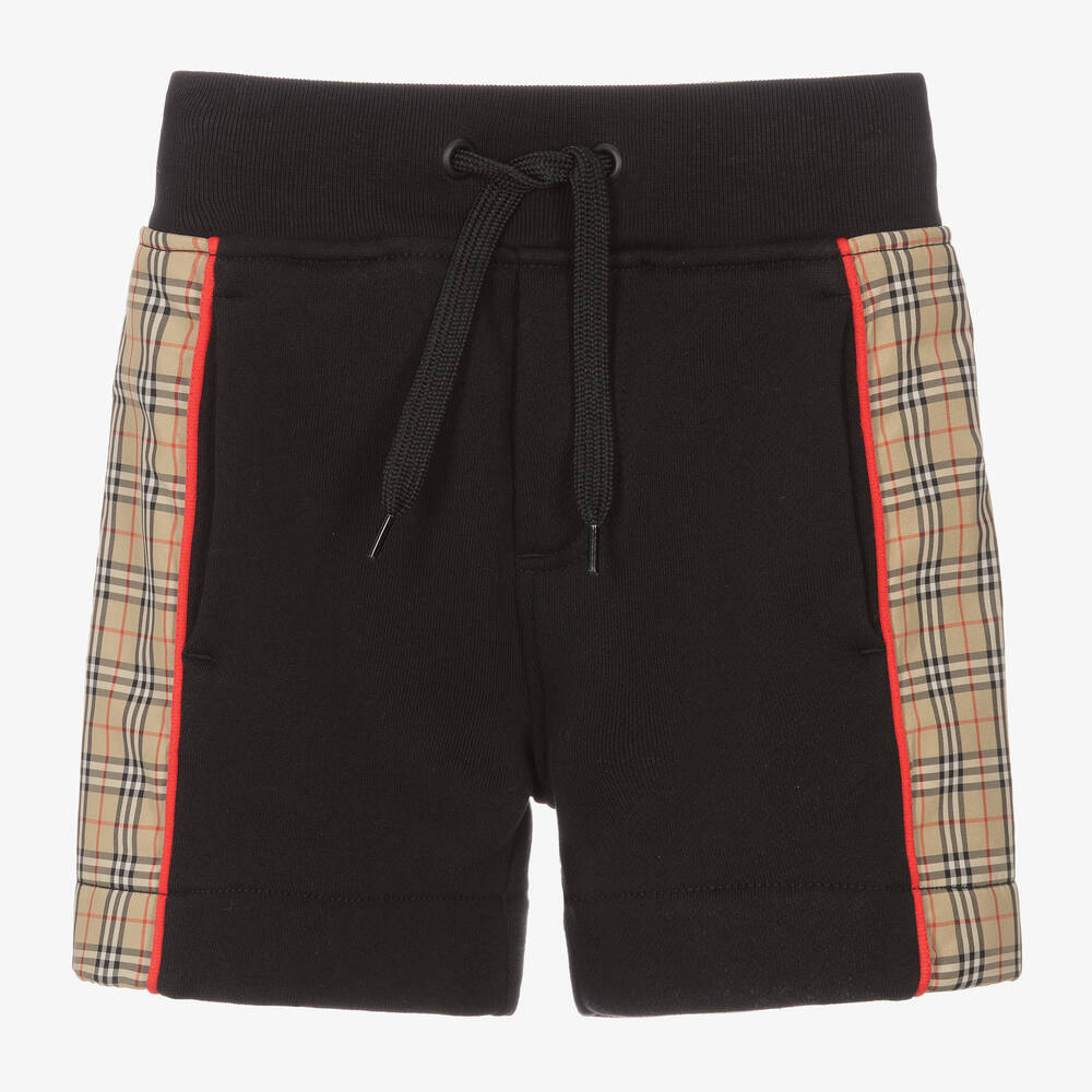 Black shorts for baby boys by luxury British brand Burberry, making an instant statement with panels of the designer's beige Vintage microcheck. They are made in comfortable sweatshirt jersey with red piping and have an elasticated waist with a useful drawstring for a good fit. There are useful concealed pockets on the front and a patch pocket around the back.