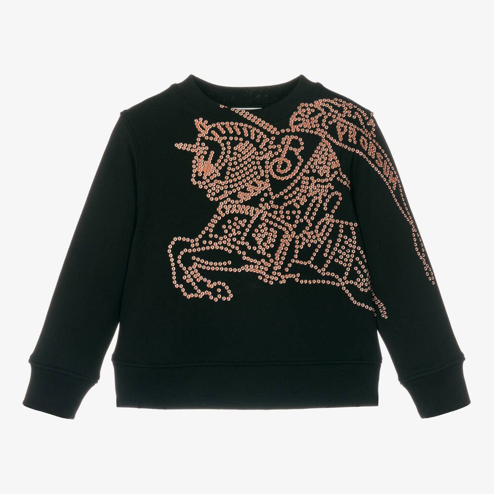 A black sweatshirt for boys and girls from luxury designer Burberry, made in soft, mid-weight cotton jersey. For instant designer appeal, it has The Equestrian Knight Design printed on the front, inspired by the dotted pattern on the British brand's adult shoe range. This casual top has long sleeves, a crew neck and comfortable ribbed trims. This product contains organic cotton.