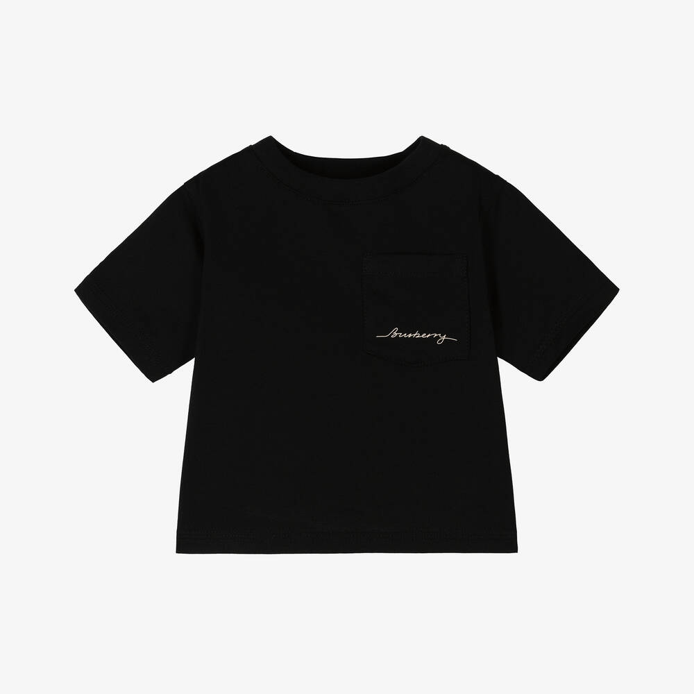 Stylish black cotton T-shirt for baby boys and girls by luxury British label, Burberry. This comfortable cotton Tee is made in soft jersey with a beige script logo on the chest pocket for a distinctive designer finish.