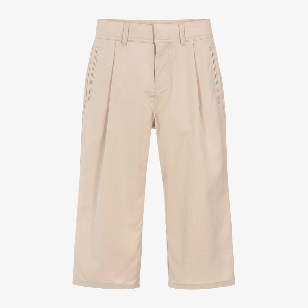 Relaxed fit, pale beige trousers for boys by luxury British fashion house Burberry. Ideal for smart-casual wear, they are made in a smooth and lightweight cotton-blend twill. The waist is adjustable for an ideal fit, with useful belt loops, and a zip and clip fastening on the front. They are finished with side seam pockets and have a tonal Equestrian Knight Design embroidered on the back pocket for subtle yet distinctive branding.