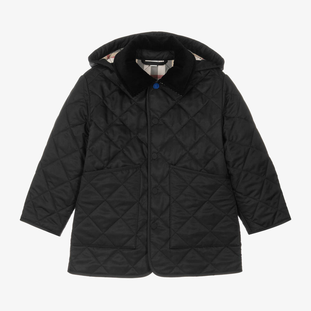 Super smooth and quilted, this lightly padded hooded jacket for boys is by luxury British label Burberry. The silky soft lining is printed with their iconic Burberry Check and there is a vibrant blue EKD logo detail on the front popper fastenings for a subtle touch of branding. Stylish yet casual, it has a tonal corduroy pointed collar, deep slip pockets, and an internal drawstring waist for an adjustable fit. The main material of this product is made with at least 50% recycled content.