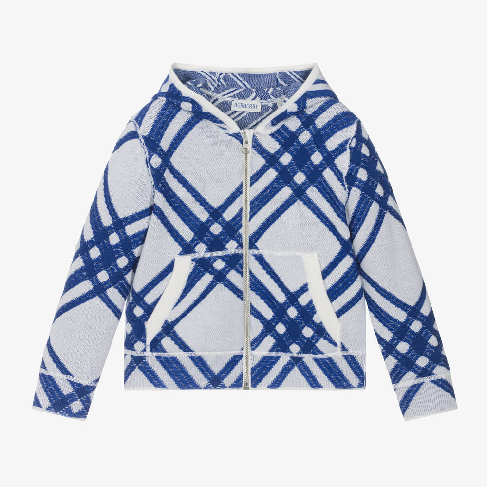 White and blue hooded zip-up top for boys by luxury British label Burberry, with a vibrant Knight blue check design. Wonderfully warm, this casual design is knitted in luxuriously soft wool, with stretchy ribbed trims. Pouch pockets add to the relaxed look and it fastens easily with a zip on the front.