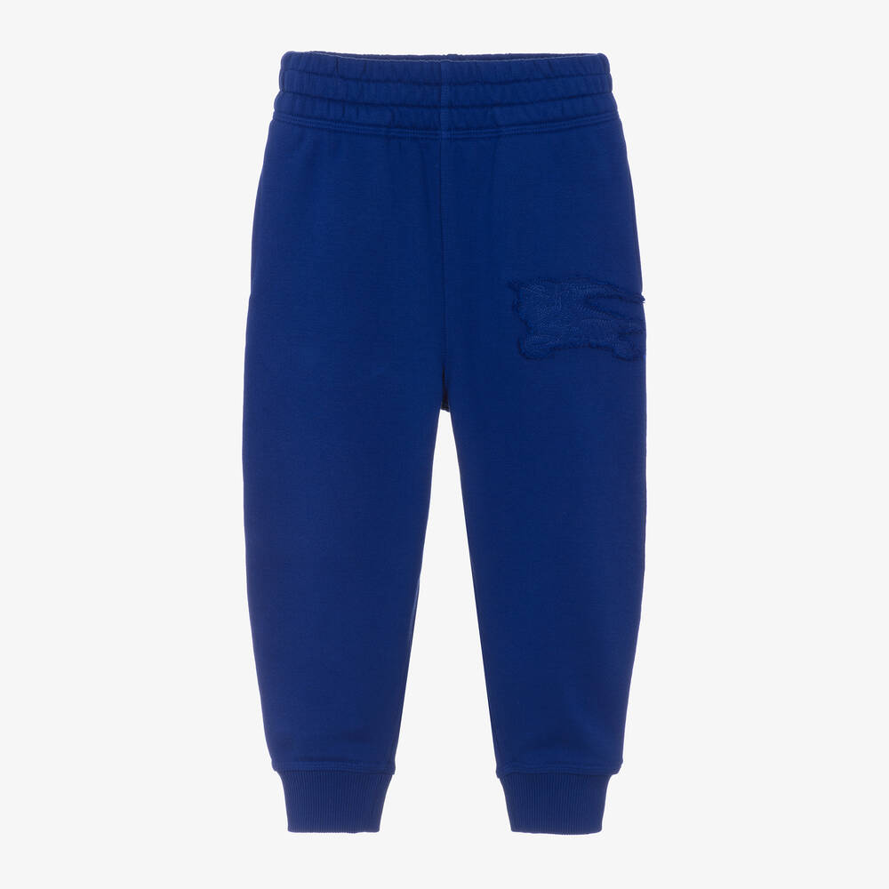 Great for a bold casual style, these Knight blue joggers for boys are by luxury British brand Burberry. A tonal Equestrian Knight Design patch with frayed edging is stitched on one side for a subtle branded statement. Comfortable to wear, they are made from soft mid-weight cotton jersey, have a comfortable elasticated waist, and stretchy cuffs. There are useful pockets hidden in the side seams for added practicality. This product contains organic cotton.