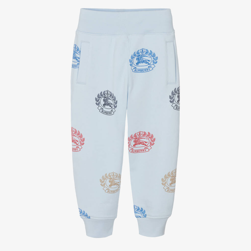 Boys pale blue joggers from luxury British brand Burberry. Made in mid-weight cotton jersey and with ribbed trims for added comfort, they are ideal for relaxing in. The waist can be adjusted with an internal drawstring for a better fit. The brand's iconic Equestrian Knight Design is printed in different colours for a fun designer finish. This product contains organic cotton.