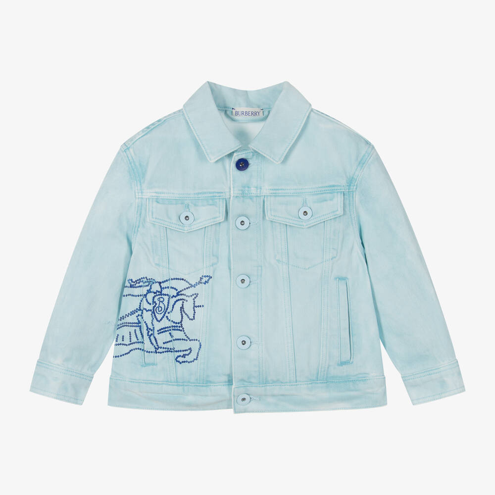 Cool pale blue mid-weight denim jacket for boys by British brand Burberry, with the designer's signature Equestrian Knight Design printed on one side in contrasting blue. With a washed and worn look, it has metal button fastenings on the front, chest pockets and cuffs, with decorative buttons on the back of the waistband. There are useful hand pockets on the front.