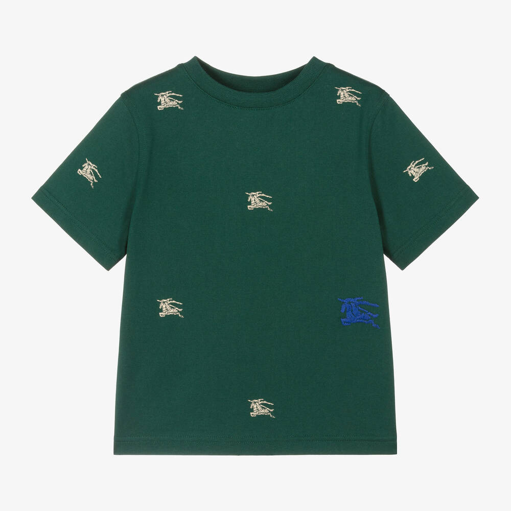 A dark moss green T-shirt for boys by luxury designer Burberry, made in soft cotton jersey with a gently ribbed crew neck. A symbol of British heritage, it is embroidered with the Equestrian Knight Design in ivory and blue shades. This product contains organic cotton.