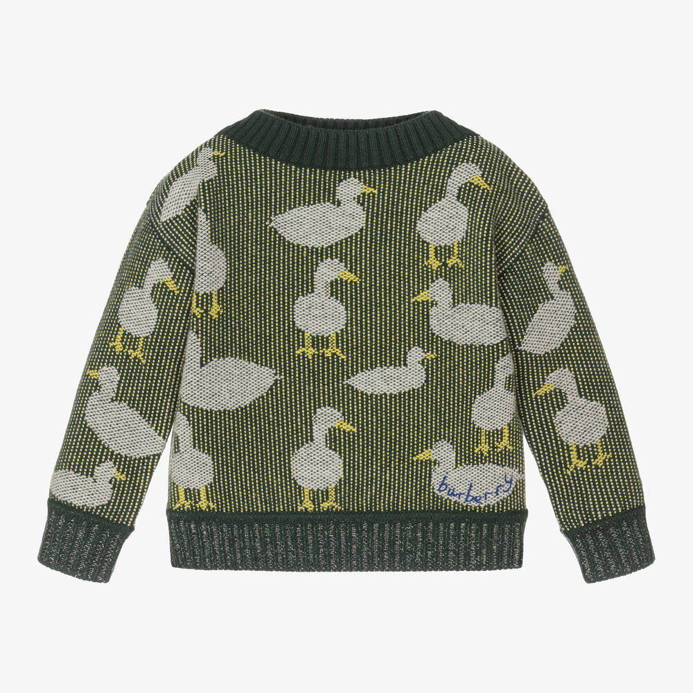 Cosy and comfortable for boys, this green sweater is by British brand Burberry. It is knitted in a luxuriously soft wool and cashmere blend, with long sleeves and ribbed trims. It features a charming all-over duck design, incorporating the designer's name in blue embroidery near the hem.