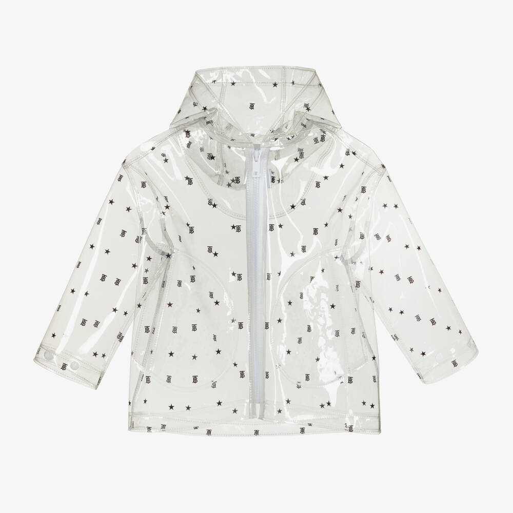 Transparent zip-up raincoat for boys, by Burberry. It has the Thomas Burberry Monogram print in black all over with stars. Made from shiny polyurethane, it is showerproof and comes with a hood and pockets.