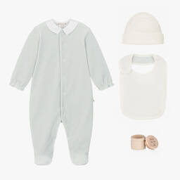 A lovely pale blue babysuit set for boys and girls by luxury designer Burberry, presented in a branded gift box. Made in soft organic cotton jersey, with Burberry Check piping, it has poppers for easy fastening. The hat has a sweet top knot and the romper has a classic Peter Pan collar, with fold over scratch mitts and feet.