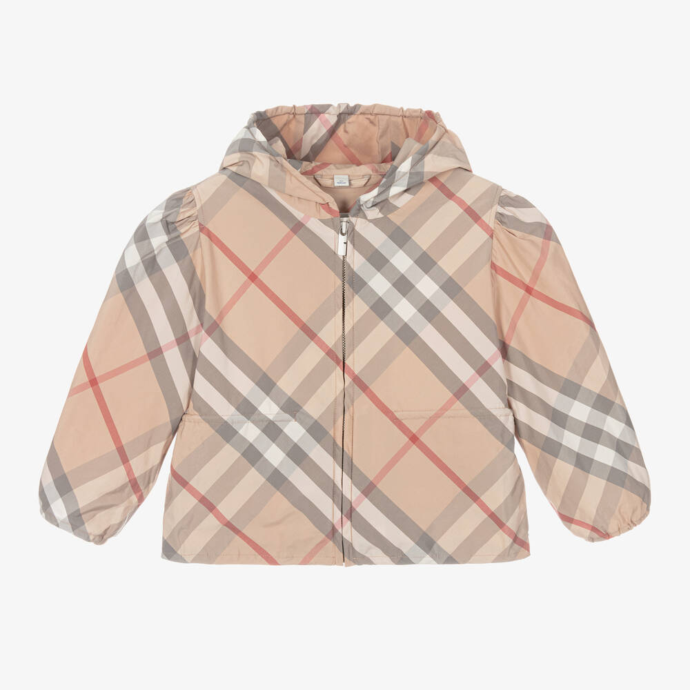Unmistakably Burberry, this beige windbreaker jacket for girls is patterned in the luxury brand's pale stone check. Silky and lightweight, it is designed with lovely puffed sleeves, a zip-up front and a gently elasticated waist with internal toggles on both sides for an adjustable fit. There are two popper fastening pockets concealed on the side seam. The hood, cuffs and hem are elasticated to help keep the elements out. The main material of this product is made with at least 50% recycled content.