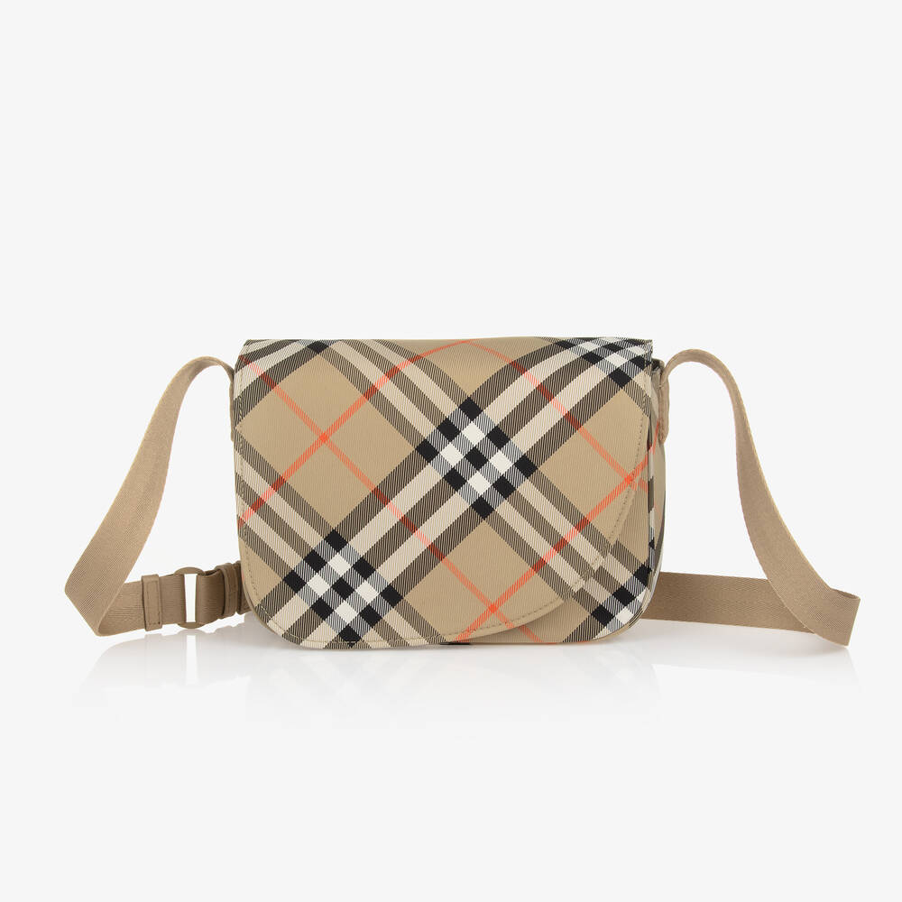 For instant designer appeal, a beige messenger bag for girls by British brand Burberry, patterned with the designer's iconic check in orange, black and white. Made in subtly ridged, sturdy nylon, it has a slightly curved front flap that fastens with a concealed magnetic popper. The main compartment has a silky lining, and a branded, checked slip pocket to keep little essentials safe. The beige webbed shoulder strap has leather trims and is adjustable.