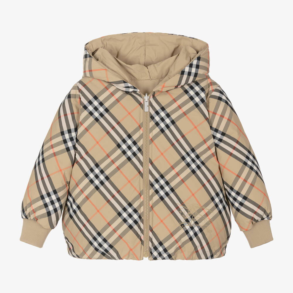 A reversible beige jacket for girls by luxury designer Burberry, embroidered with the symbolic Equestrian Knight Design on both sides. Great for creating many different looks, this hooded style switches from the statement Burberry Check to a solid beige colourway. It has a silky smooth feel and is padded with luxurious down for warmth without the weight. Other features include a signature B-cut zip pull, ribbed knit cuffs and a gently elasticated hem for added comfort. Seam pockets fasten securely with poppers.