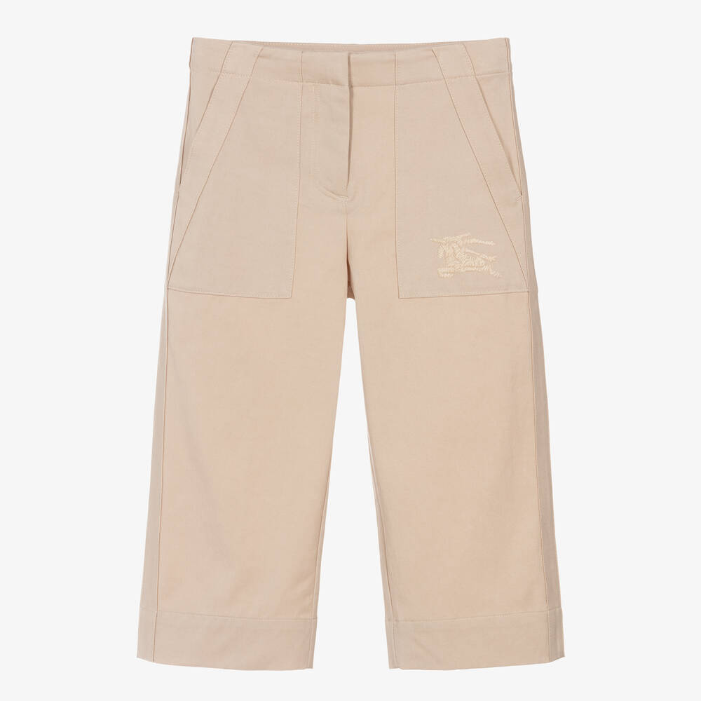 Pale beige wide-leg trousers for girls by luxury British fashion house Burberry. Woven in a soft cotton-blend twill, these stylish trousers are in a relaxed fit, with an adjustable waist for extra comfort. They have a concealed zip and hook fastening on the front. There are two front patch pockets and an additional back pocket, the front one embroidered with a tonal EKD logo for a subtle yet distinctive designer touch.