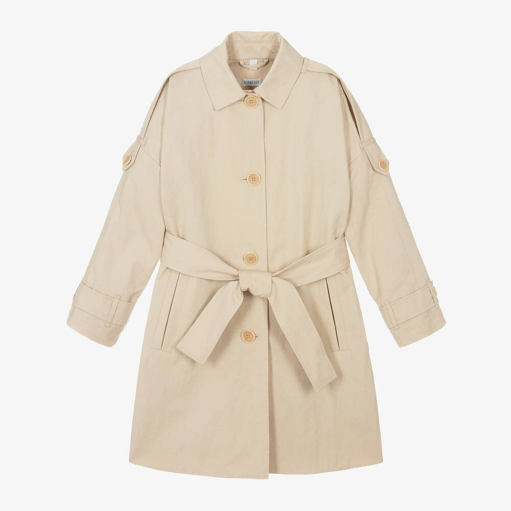 A smart beige car coat for girls by luxury label Burberry, lined in the British brand's recognisable pale stone check design. This traditional style features a pointed collar, epaulettes and adjustable button tabs on the cuffs. There are useful pockets and button fastenings on the front and it comes with a detachable tie belt to trim the waist and add shape. The main material of this product is made with at least 50% recycled content.