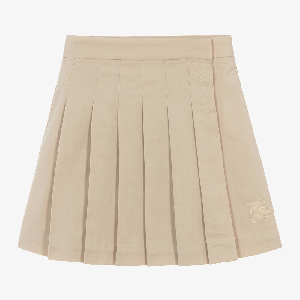 Lovely pale beige twill skirt for girls by luxury British brand, Burberry. It is made in a soft blend of cotton and lyocell with a silky soft lining for comfort. A tonal Equestrian Knight Design is embroidered on one side, adding a subtle reference to the fashion house's signature code. This smart casual, preppy look has a pleated wrap-over front with hook and eye fastenings and an adjustable waistband on smaller sizes.