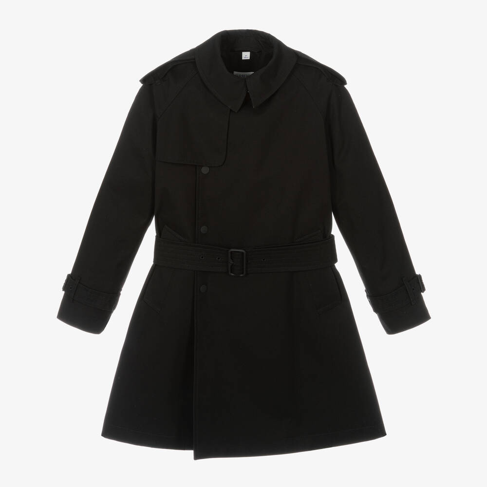 Sleek and stylish black Mini-me trench coat for girls by British luxury brand Burberry. This water-resistant coat is made in organic cotton gabardine with the signature Burberry check lining in pale khaki green and black. The brand's heritage styling, including epaulettes, belted cuffs, gun flap, storm flap and a checked undercollar can be seen throughout the minimalistic design. It comes with a detachable belt that sits lower on the waist for a contemporary twist. Adding simplicity to the look, all the hardware and popper fastenings are in matt black.