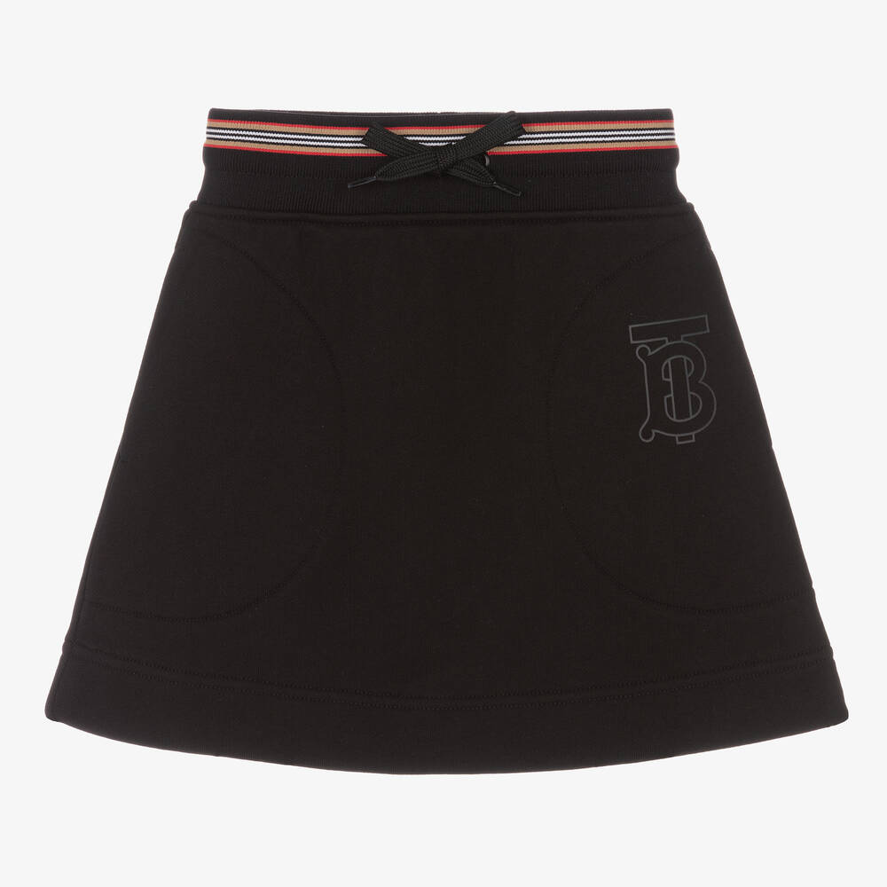 Black skirt for girls by luxury British brand Burberry. Making an instant statement, it has the designer's Monogram logo on the front, with their signature Icon stripe on the ribbed waistband. Easy and comfortable to wear, the skirt is made in soft mid-weight cotton jersey. The waist has a drawstring tie to adjust the fit and there are large rounded pockets on the front.