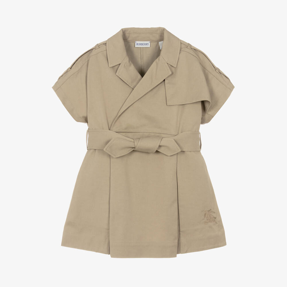 In light khaki green, a lovely cotton-blend twill dress for girls by luxury British fashion house Burberry. Inspired by the house's iconic trench coat, this stylish design has epaulettes on the shoulders, a gun flap on one side, and a detachable tie belt. For subtle yet distinctive branding, a tonal embroidered Equestrian Knight Design can be seen at the hem.