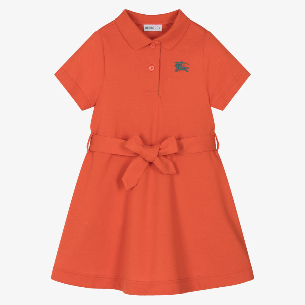 Orange polo dress for girls by luxury brand Burberry, made in soft organic cotton piqué. In a flared shape with a detachable piqué tie belt around the waist, it has short sleeves and a ribbed collar. The button placket is lined in Burberry Check and the iconic Equestrian Knight Design is embroidered on the chest in blue.