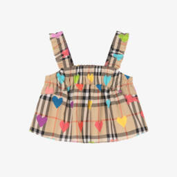 Girls pale pink sleeveless blouse by luxury British brand Burberry, woven in soft, lightweight cotton. Patterned with the iconic Burberry Check design, this timeless style is gently shirred and gathered on the front. It has a frilled neckline and fastens neatly with concealed buttons.