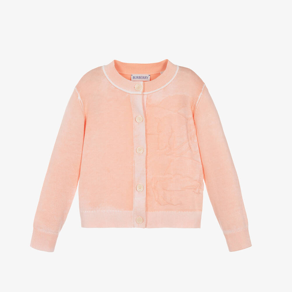 A delightful long-sleeved cardigan for girls by luxury British label Burberry, in a pretty shade of pale coral pink. Made from a soft cotton knit, it has a cool washed look, branded button fastenings and ribbed trims to enhance the casual style. There is an iconic tonal jacquard Equestrian Knight Design on one side for a subtle yet distinctive finish.