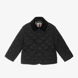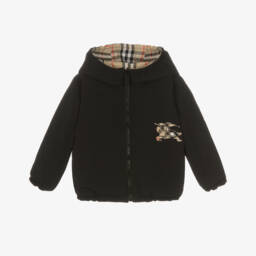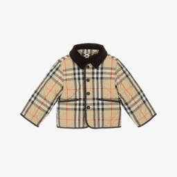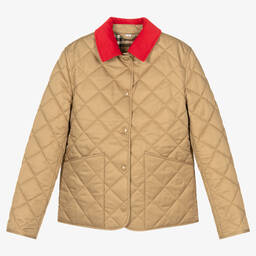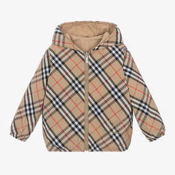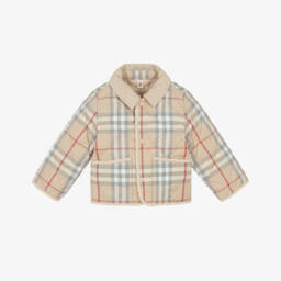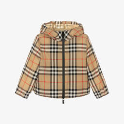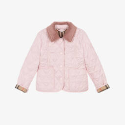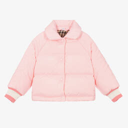 Pink puffer jacket for girls by luxury British brand Burberry. Made in soft smooth fabric, it has a silky smooth lining patterned with the brand's iconic Vintage check. Down padded for warmth, it has ribbed pink and ivory striped cuffs for extra cosiness. There is a rounded collar, concealed popper-fastening side seam pockets and branded popper fastenings on the front. For a discreet designer finish, there is logo lettering stitched across the top of both sleeves. This item contains at least 70% recycled material.