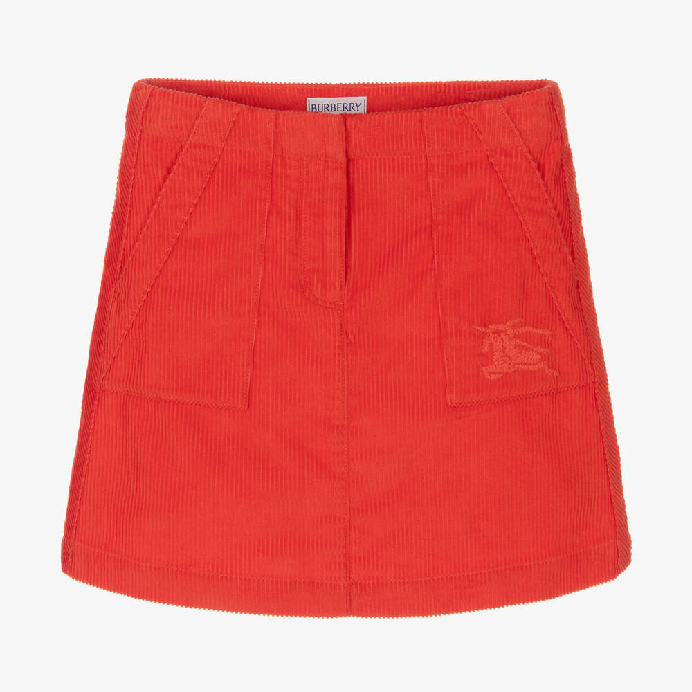 Coral red corduroy skirt for girls by luxury British brand Burberry, designed in a stylish A-line shape. For a subtle designer touch, tonal EKD embroidery can be seen on one of the front patch pockets and for a neat finish, there is a concealed hook and eye and zip fastening on the front. To ensure an ideal fit, the skirt has an adjustable waistband.