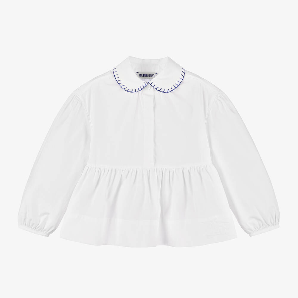 A lovely white blouse for girls by luxury British fashion house Burberry. It has a pretty peplum hem, embroidered with a tonal Equestrian Knight Design for subtle yet distinctive branding. The long sleeves are gently puffed, and the classic Peter Pan collar is trimmed with contrast stitching in blue. Made in stretch cotton poplin for comfort, the top fastens with concealed buttons on the front.