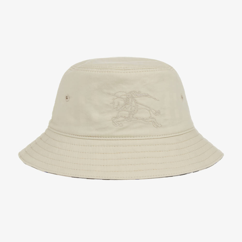 Reversible grey-beige cotton bucket hat for baby boys and girls by luxury British brand Burberry. This reversible design has an embroidered EKD tonal logo on one side, whilst the reverse is patterned with the brand's signature Burberry Check with a vibrant Knight blue stripe.