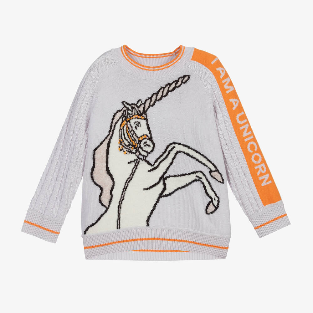 Girls light grey sweater from luxury brand Burberry, with orange 'I'm a Unicorn' intarsia trim on one sleeve. Knitted in a soft wool and cashmere blend, with a cable knit pattern on the sleeves and back. There is a black and pink unicorn design on the front, inspired by an archive emblem found on Thomas Burberry’s personal silverware. A white and black logo patch is sewn onto the back.