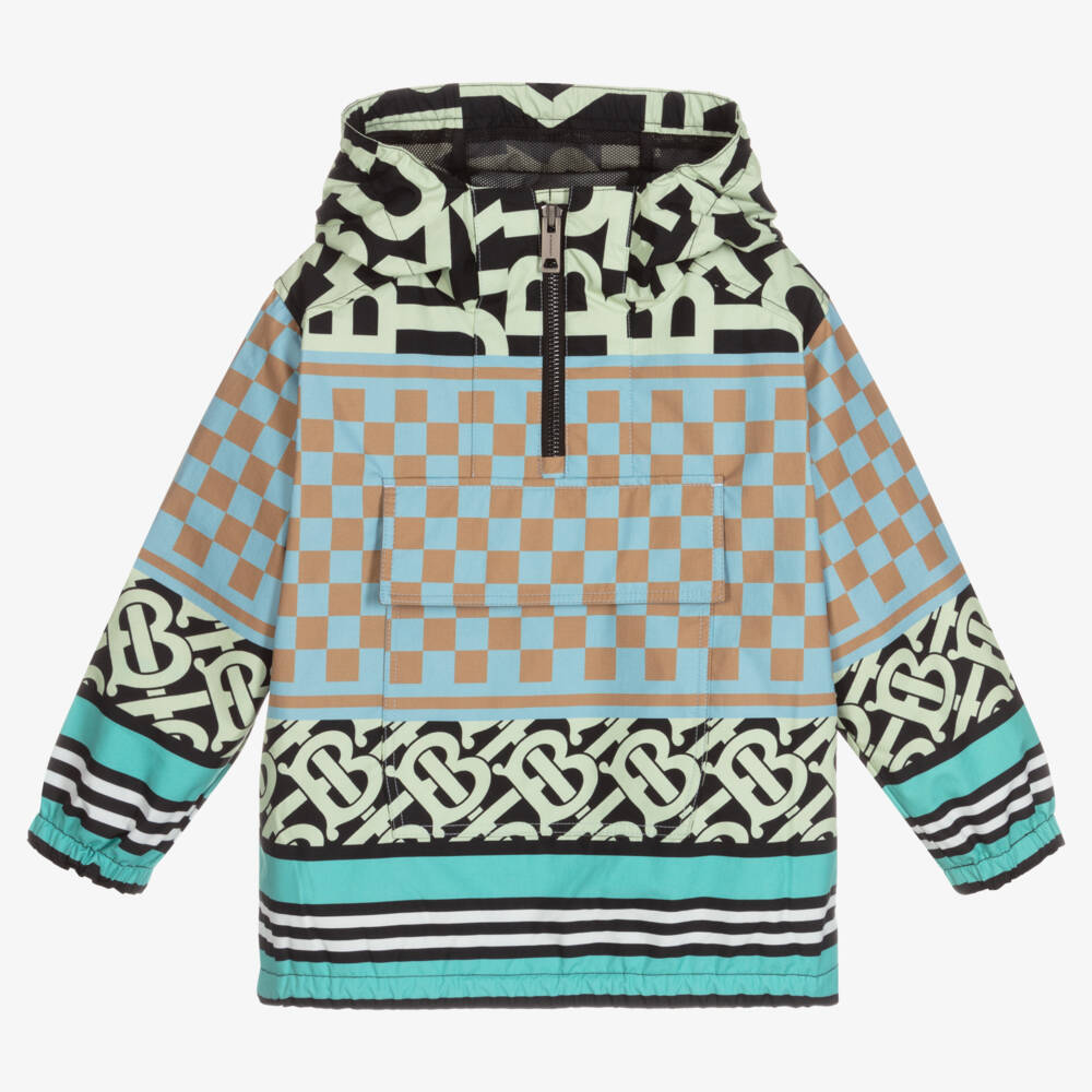 Jade blue Montage print nylon jacket for boys by Burberry. In a windcheater pull-on style, it has a half-zip and oversized chest pocket and side seam pockets with popper closure. The lightweight fabric has a colourful mixed print of the designer's house codes in shades of blue, green, black and beige, with a mesh lining.