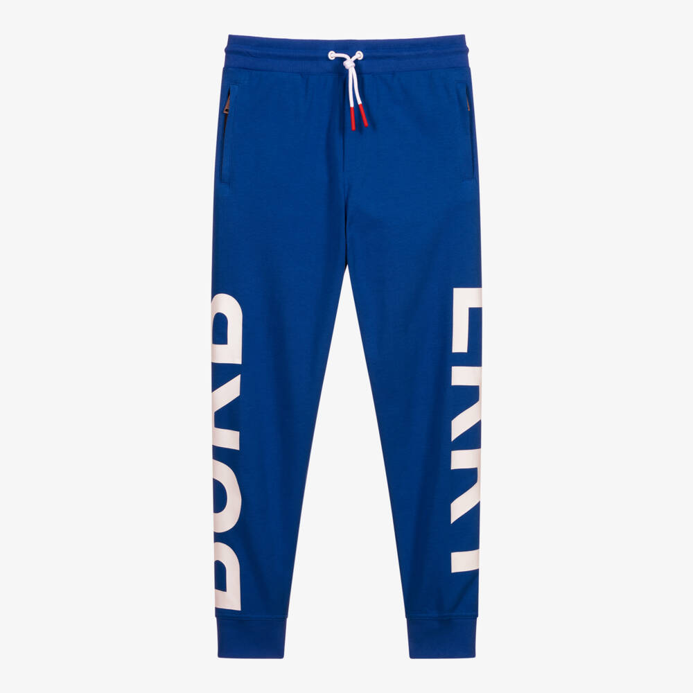 Cobalt blue 'Farren' joggers for teen boys by Burberry. Styled in mid-weight soft cotton jersey, they have an adjustable drawstring waist with white and red-tipped laces. The brand's logo is printed in large lettering down both legs in white and there are side pockets with metal zips.