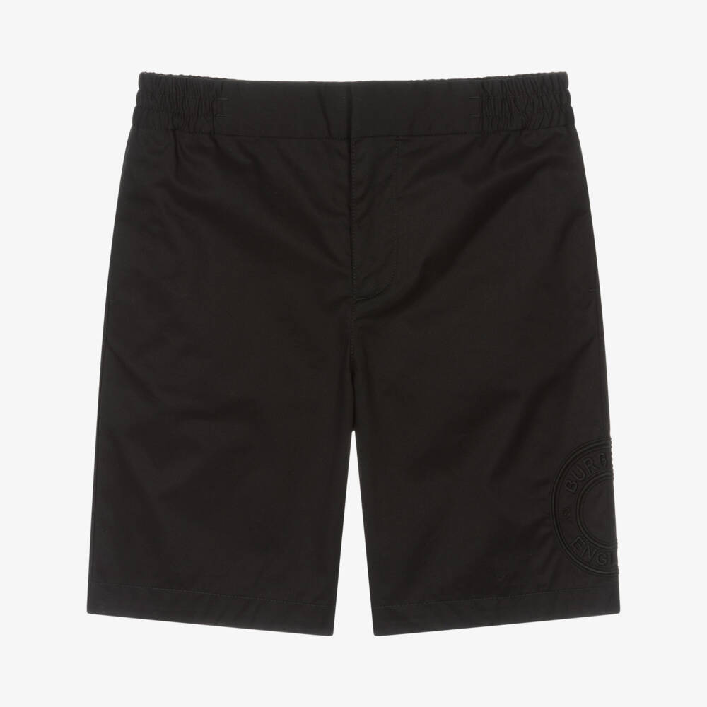 Smart casual black shorts for teen boys by luxury British brand Burberry, with a tonal logo embroidered on one leg. Smartly tailored in smooth cotton twill, they have side seam pockets and a pocket on the back. They have a concealed zip and clip fastening and an elasticated waistband for comfort and fit.