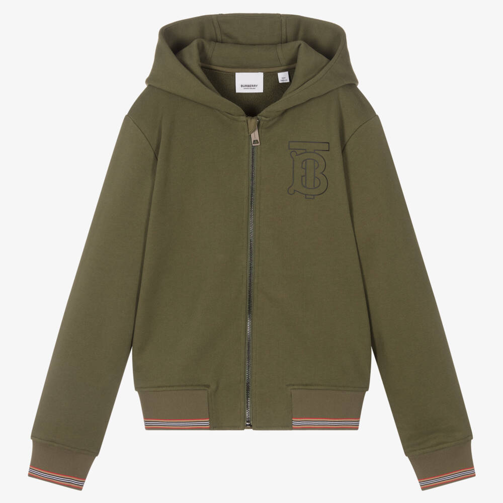 Stylish khaki green hooded zip-up top for teen boys by luxury British brand Burberry, with the designer's TB Monogram logo on the chest. Making an instant statement, it has the brand's signature Icon stripe on the ribbed cuffs and hem. Cosy and comfortable to wear, the top is made in soft mid-weight cotton jersey. There are concealed side seam pockets, with a branded zip puller adding a distinctive designer finish.