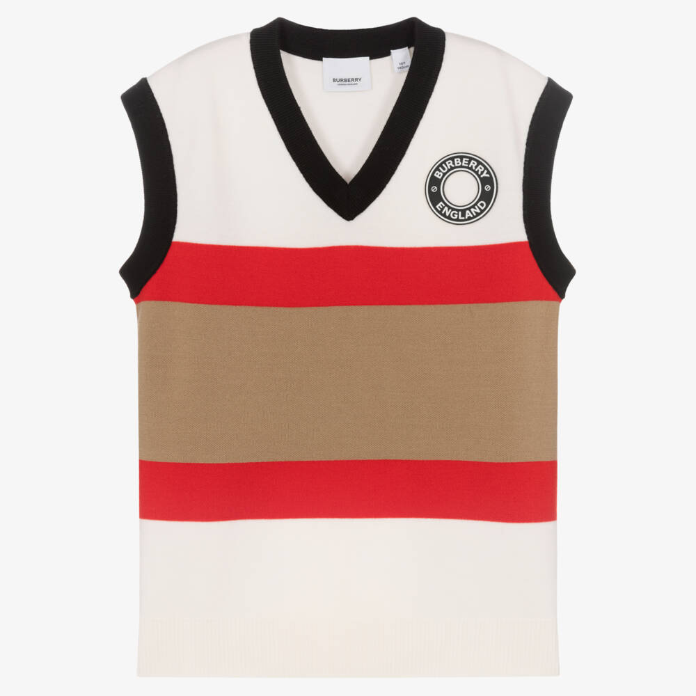Stylish knitted vest top for teen boys by luxury British brand Burberry, with a black and white rubberised logo patch on the chest. Styled in the designer's classic icon stripe, it features bold ivory, red and beige stripes, with black trims. This warm and comfortable V-neck top is made in super soft responsibly sourced Merino wool.