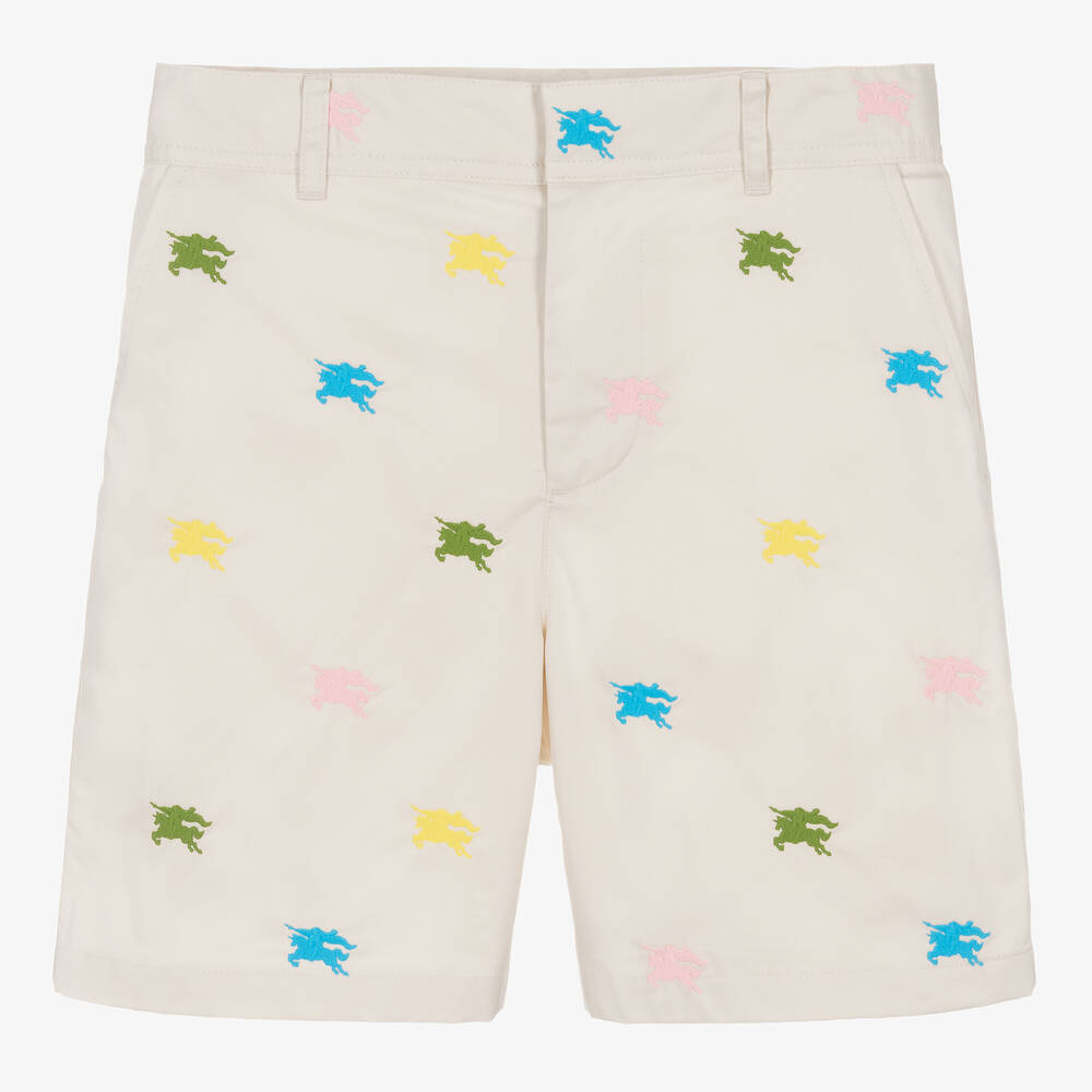 Teen boys ivory twill shorts, designed by Burberry with colourful Equestrian Knight Design embroidery. Elevating the classic bermuda style, these statement shorts have sleek slanted pockets, a back pocket and belt loops. Made from twill and fully lined, they are secured with a hook and zip.