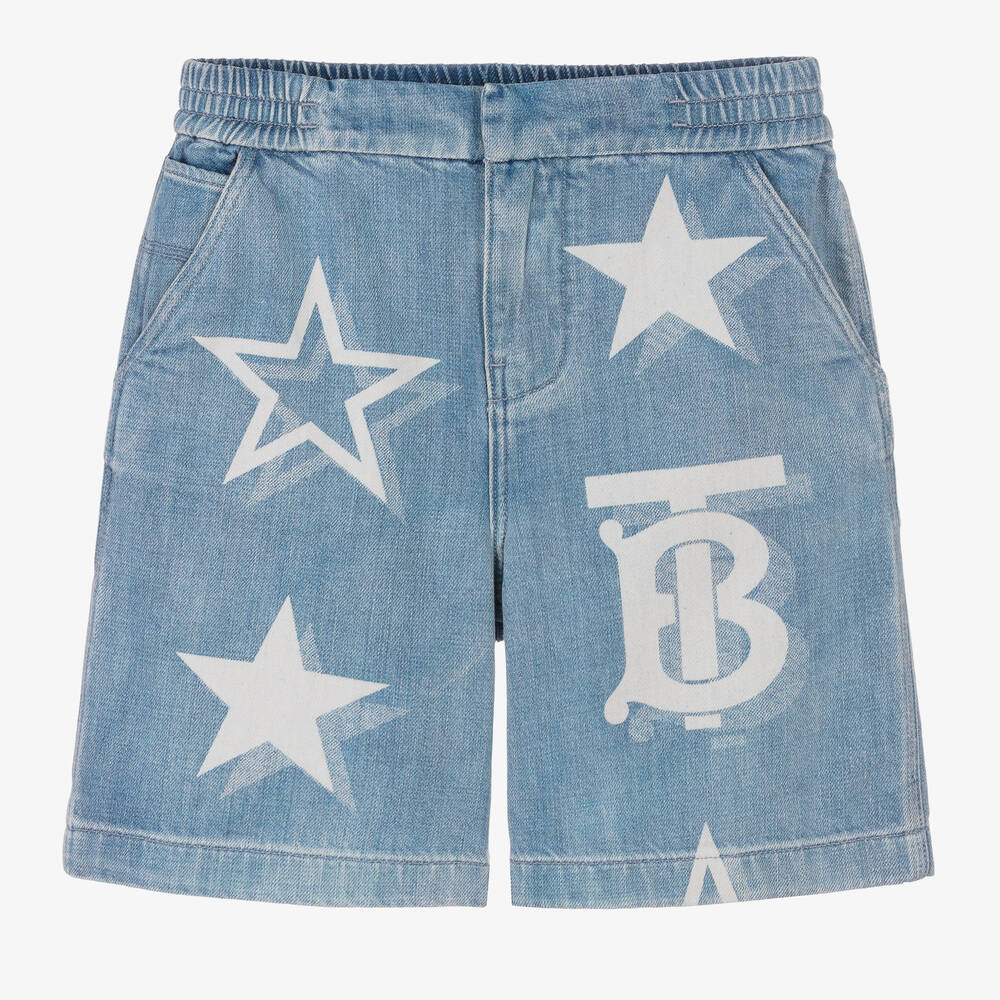 Light blue denim wash shorts for teen boys by British luxury brand Burberry, recognisable with a combination of white stars and Thomas Burberry Monogram logos. Celebrating selvedge craftsmanship, this essential style has handy pockets and carpenter style detailing on the back. They have an elasticated waist for a custom fit and a branded zip and hook fastening concealed on the front.