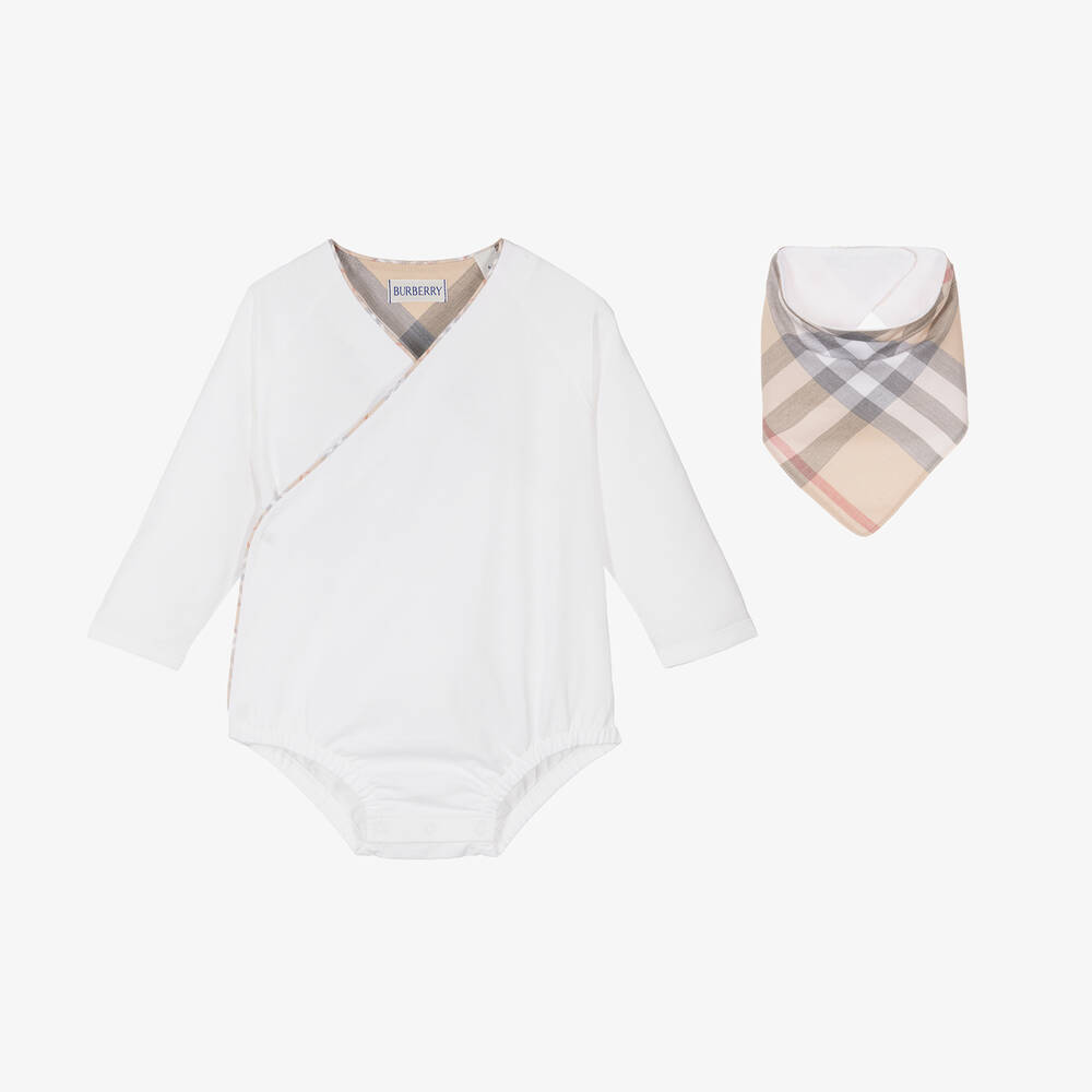 Lovely white babysuit gift set for little boys and girls by British luxury brand, Burberry. Ideal as a gift for a special new arrival, this set comes with a wrap-style bodyvest and an iconic pale stone check bandana bib. The bodyvest fastens with poppers on the front and between the legs for easy dressing. The bib has useful poppers on the back of the neck and is lined in soft cotton towelling for gentle comfort and absorbency.