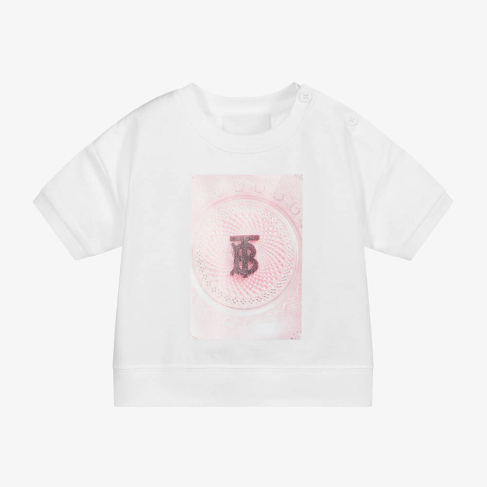 White T-shirt for baby girls by British brand Burberry. Made in comfortable cotton jersey, it has a pink print on the front with the Thomas Burberry Monogram in the centre. There are useful button fastenings on one shoulder.